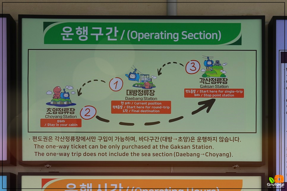 대방 정류장 앞에 무료 주차를 하고 입장권을 구입한 후 에스컬레이터를 타고 2층으로 올라가면 탑승장이 있다. 입구는 일반 캐빈과 크리스탈 캐빈으로 나누어져 있다.