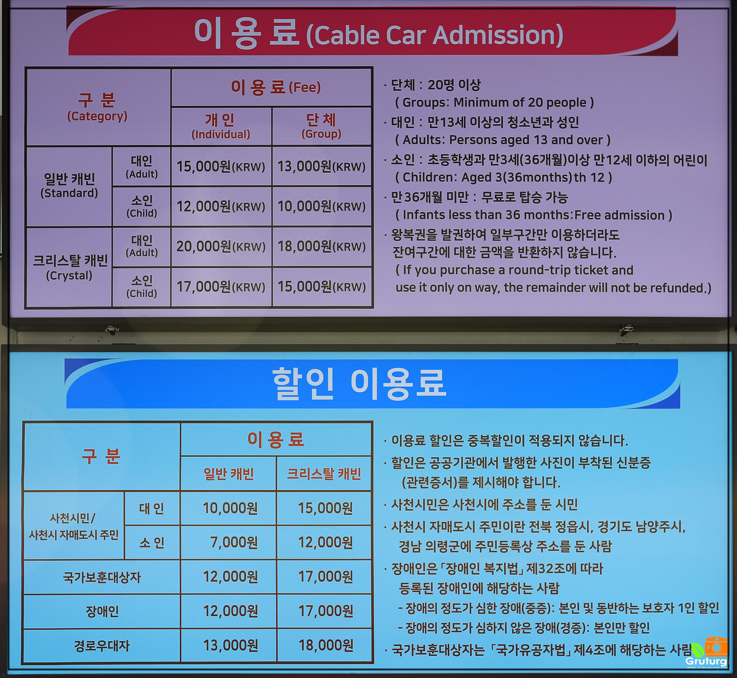 크리스탈 캐빈 왕복 대인 20,000원, 소인 17,000원 / 편도 대인 12,000원, 소인 9,000원